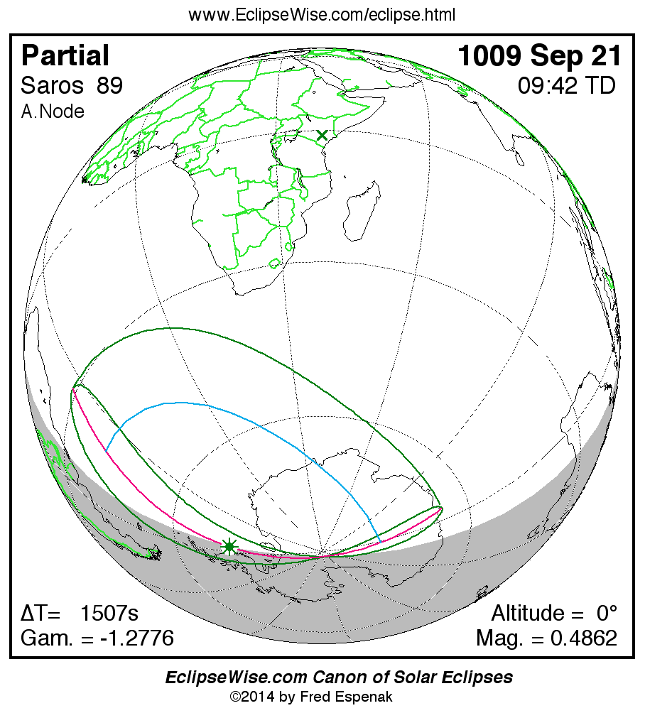 The instant of greatest eclipse takes place on 1009 Sep 21 at 09:42:17 TD (09:17:11 UT1).