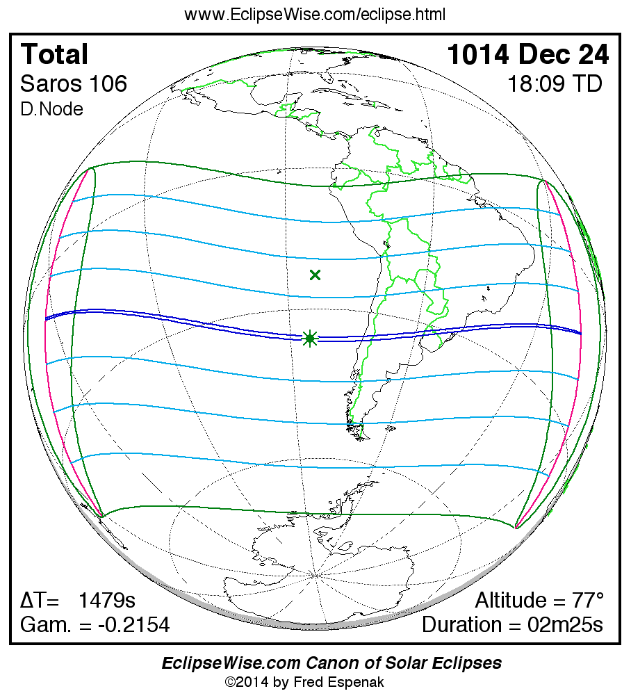 The total solar eclipse of 1014 Dec 24 is preceded two weeks earlier by a penumbral lunar eclipse on 1014 Dec 09.