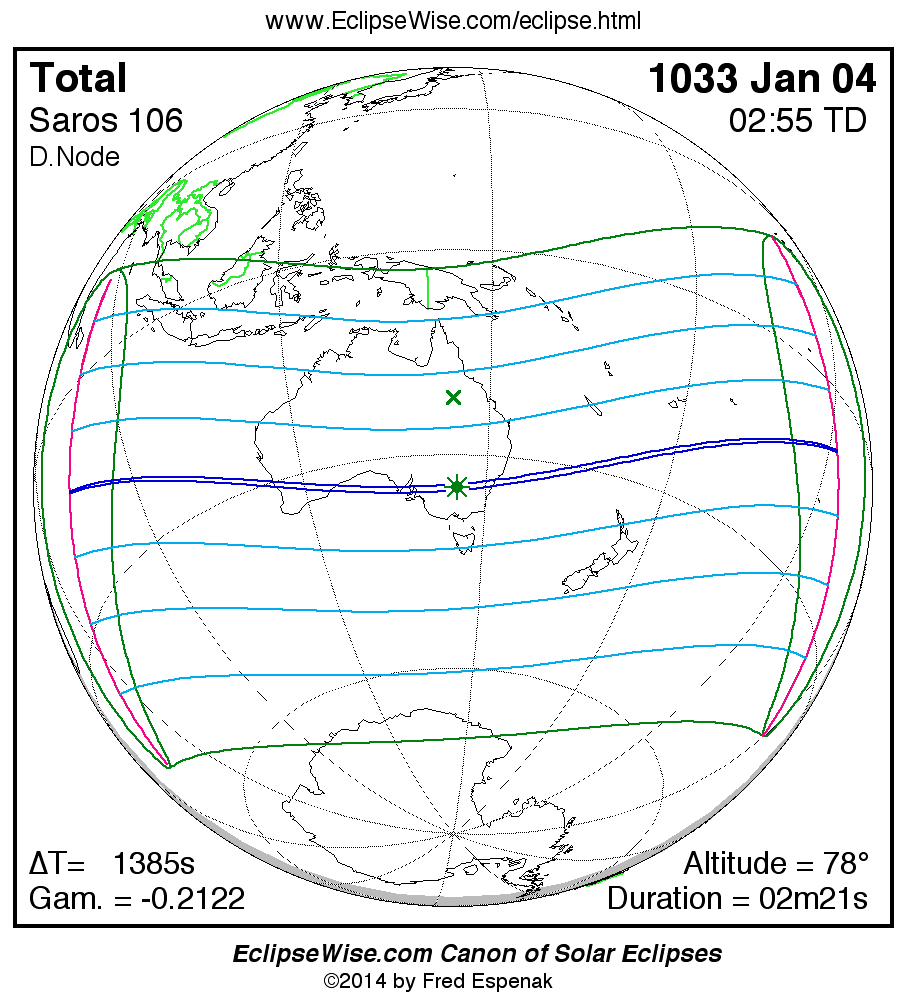 The instant of greatest eclipse takes place on 1033 Jan 04 at 02:54:45 TD (02:31:40 UT1).