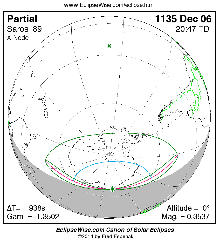 The instant of greatest eclipse takes place on 1135 Dec 06 at 20:46:52 TD (20:31:14 UT1).