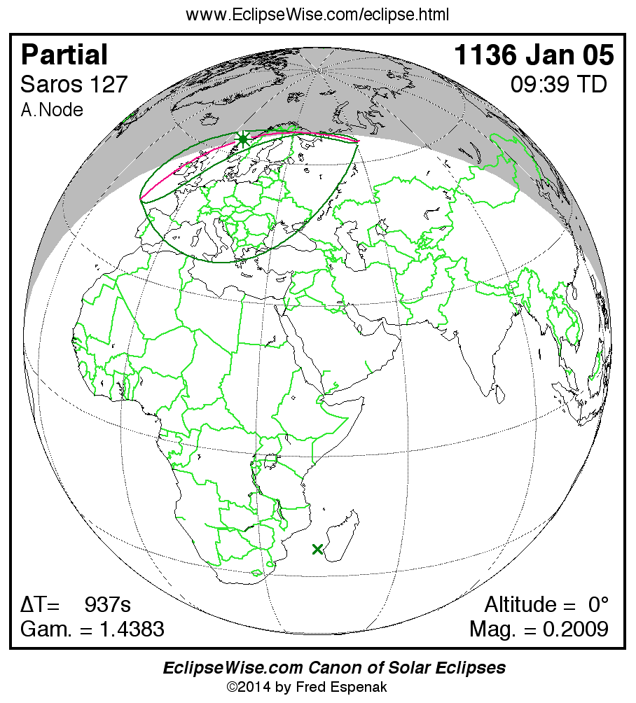 The instant of greatest eclipse takes place on 1136 Jan 05 at 09:38:51 TD (09:23:14 UT1).