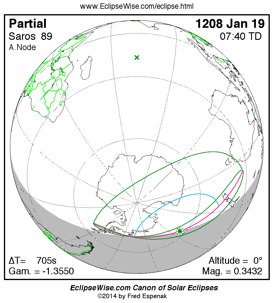 The instant of greatest eclipse takes place on 1208 Jan 19 at 07:39:45 TD (07:28:01 UT1).