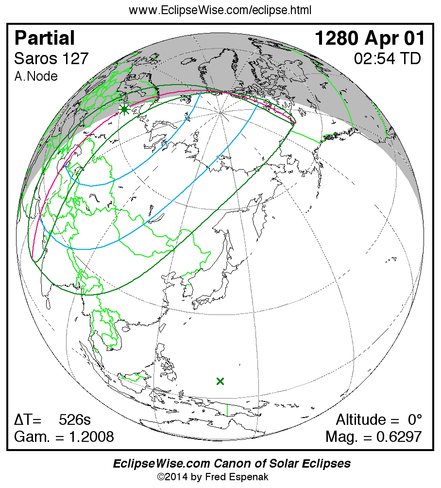 The instant of greatest eclipse takes place on 1280 Apr 01 at 02:54:17 TD (02:45:31 UT1).
