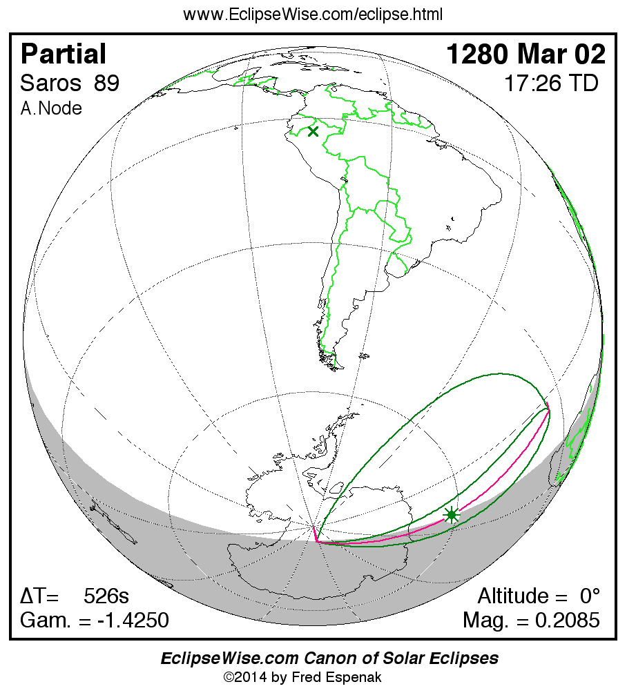 The instant of greatest eclipse takes place on 1280 Mar 02 at 17:25:35 TD (17:16:49 UT1).