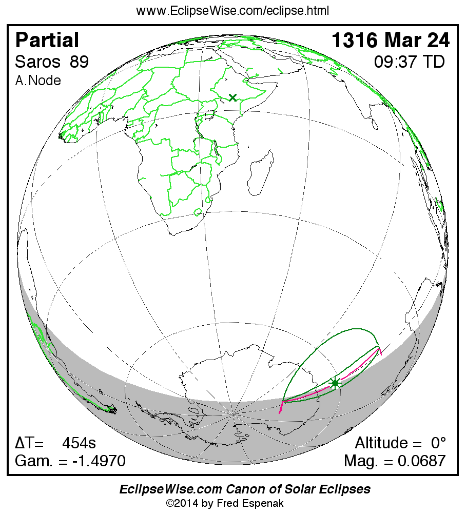 The instant of greatest eclipse takes place on 1316 Mar 24 at 09:36:43 TD (09:29:10 UT1).