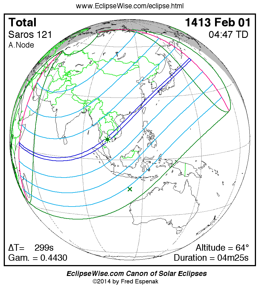 - Orthographic Map: Total Solar Eclipse of 1413 Feb 01 - global map of eclipse visibility