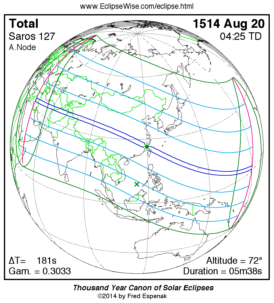 - Orthographic Map: Total Solar Eclipse of 1514 Aug 20 - global map of eclipse visibility