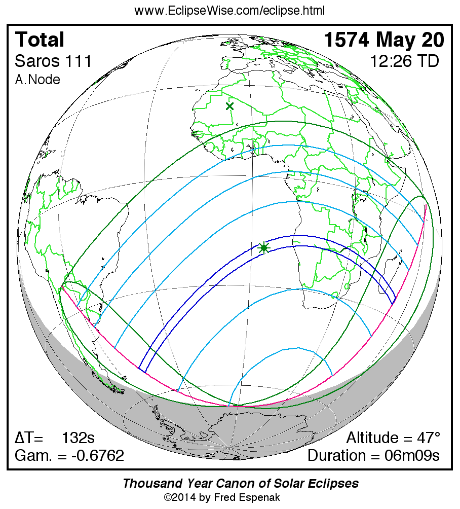 - Orthographic Map: Total Solar Eclipse of 1574 May 20 - global map of eclipse visibility