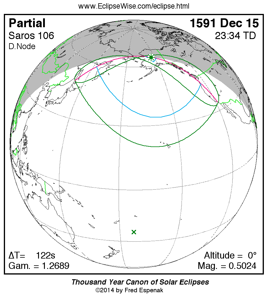 The instant of greatest eclipse takes place on 1591 Dec 15 at 23:33:55 TD (23:31:53 UT1).