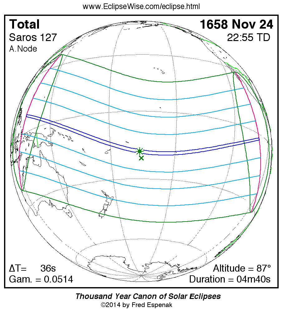 - Path Table: Total Solar Eclipse of 1658 Nov 24 - coordinates of the central line and path limits