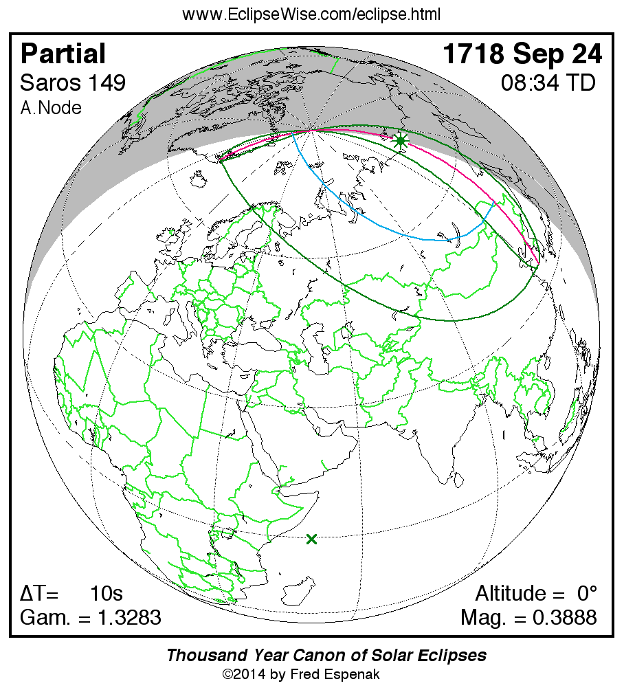 The instant of greatest eclipse takes place on 1718 Sep 24 at 08:34:19 TD (08:34:10 UT1).
