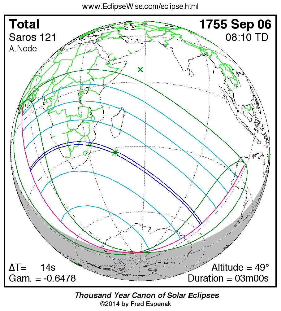 The instant of greatest eclipse takes place on 1755 Sep 06 at 08:09:45 TD (08:09:32 UT1).