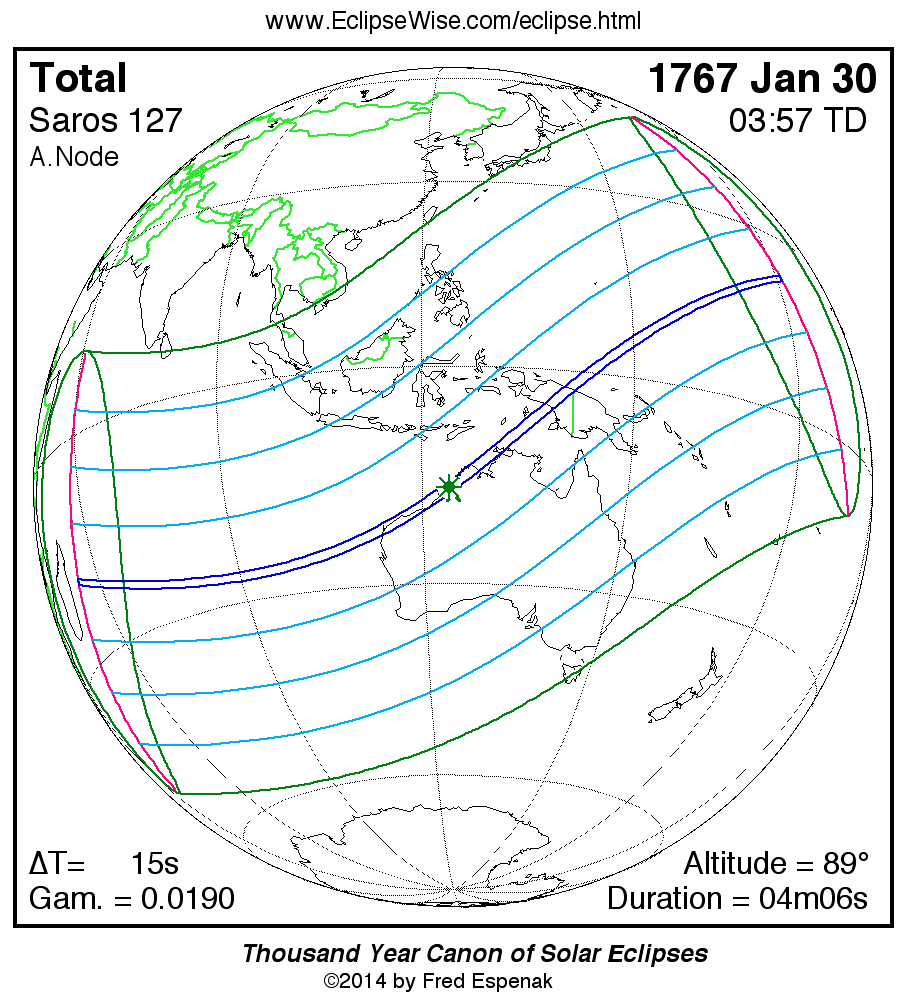 - Path Table: Total Solar Eclipse of 1767 Jan 30 - coordinates of the central line and path limits