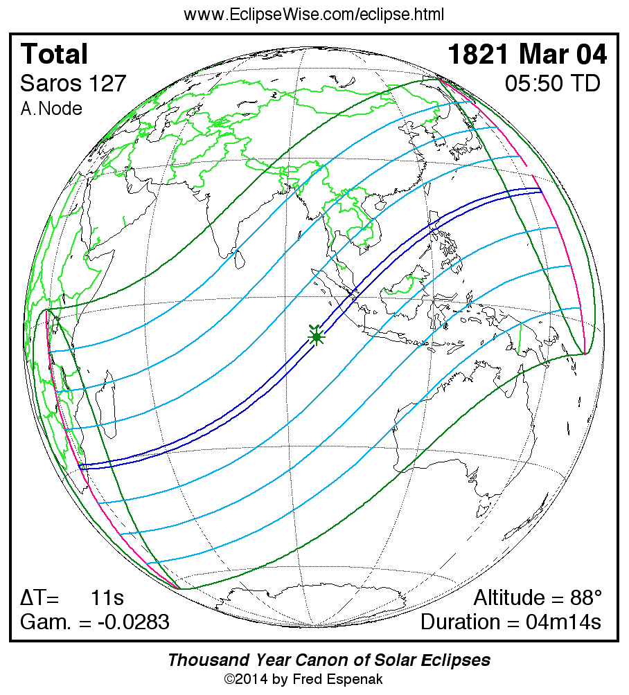 - Path Table: Total Solar Eclipse of 1821 Mar 04 - coordinates of the central line and path limits