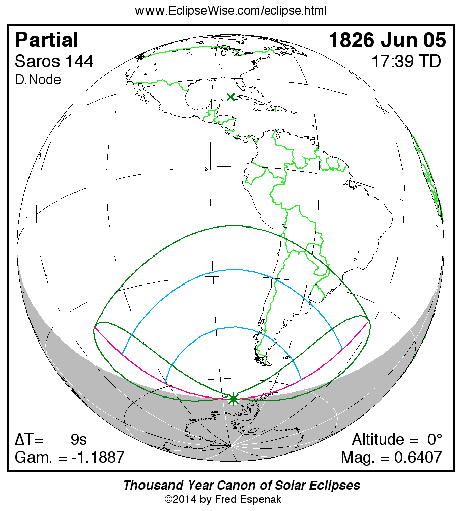 The instant of greatest eclipse takes place on 1826 Jun 05 at 17:39:04 TD (17:38:55 UT1).
