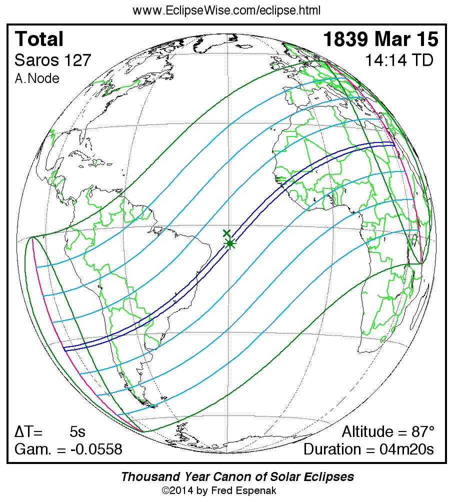 - Path Table: Total Solar Eclipse of 1839 Mar 15 - coordinates of the central line and path limits