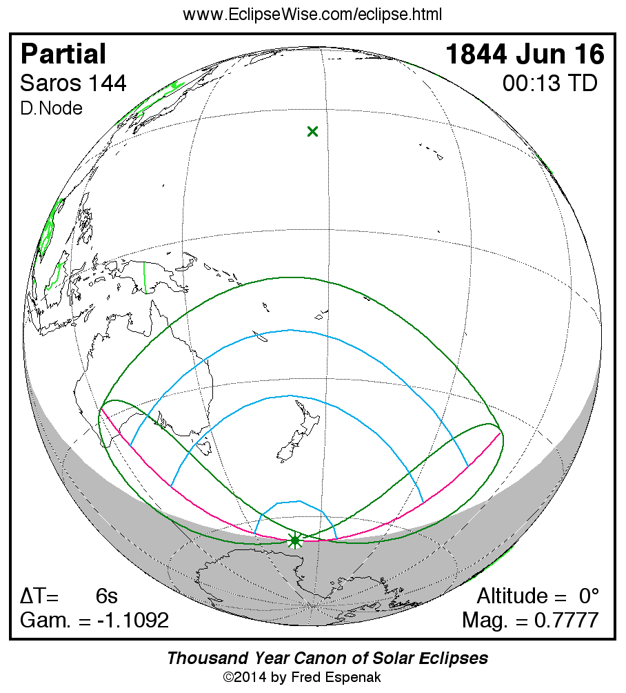 The instant of greatest eclipse takes place on 1844 Jun 16 at 00:13:21 TD (00:13:16 UT1).