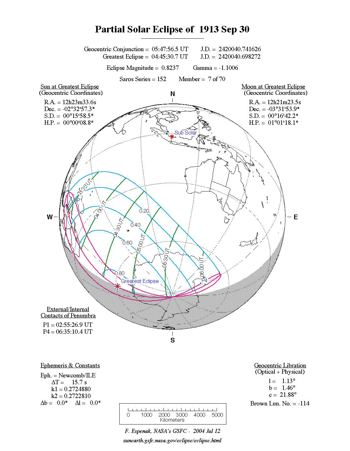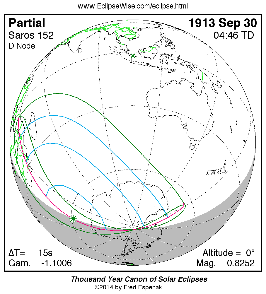 - Orthographic Map: Partial Solar Eclipse of 1913 Sep 30 - detailed global map of eclipse visibility (Key to Figure)