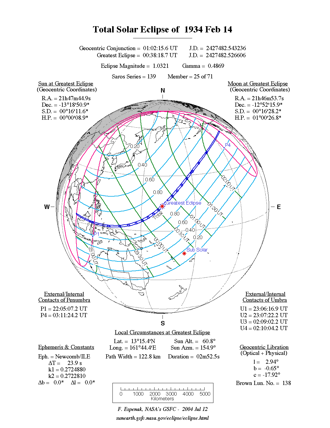 - Path Table: Total Solar Eclipse of 1934 Feb 14 - coordinates of the central line and path limits