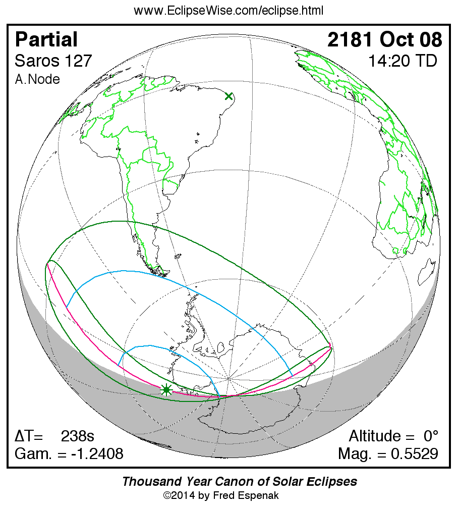 The instant of greatest eclipse takes place on 2181 Oct 08 at 14:19:36 TD (14:15:38 UT1).