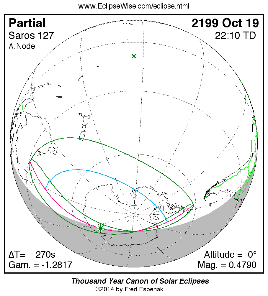 The instant of greatest eclipse takes place on 2199 Oct 19 at 22:10:26 TD (22:05:56 UT1).