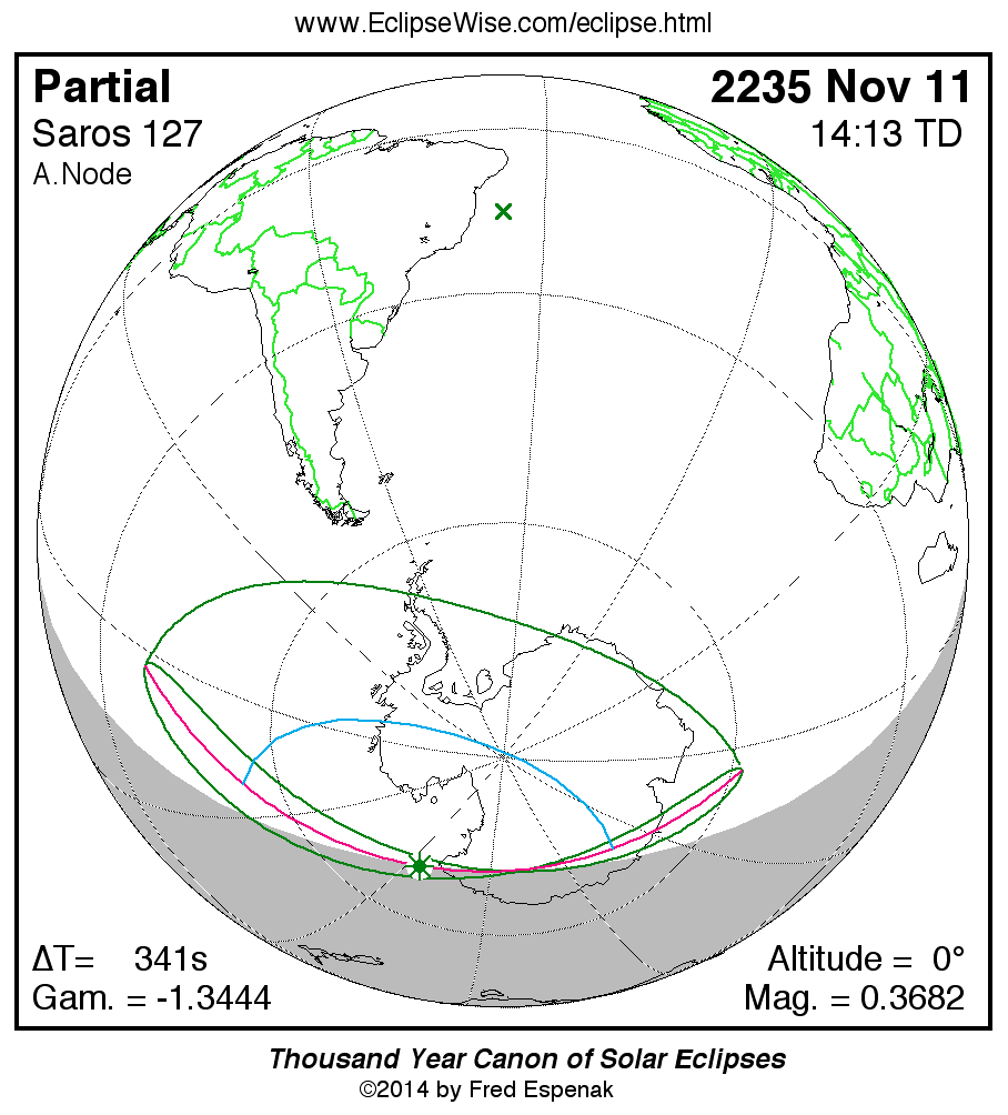 The instant of greatest eclipse takes place on 2235 Nov 11 at 14:13:08 TD (14:07:27 UT1).