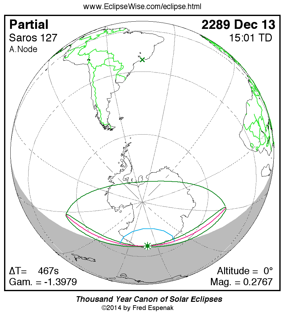 The instant of greatest eclipse takes place on 2289 Dec 13 at 15:01:17 TD (14:53:30 UT1).