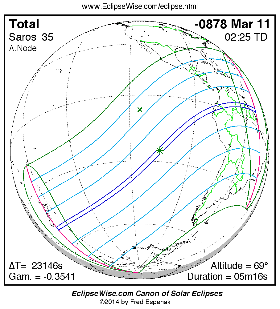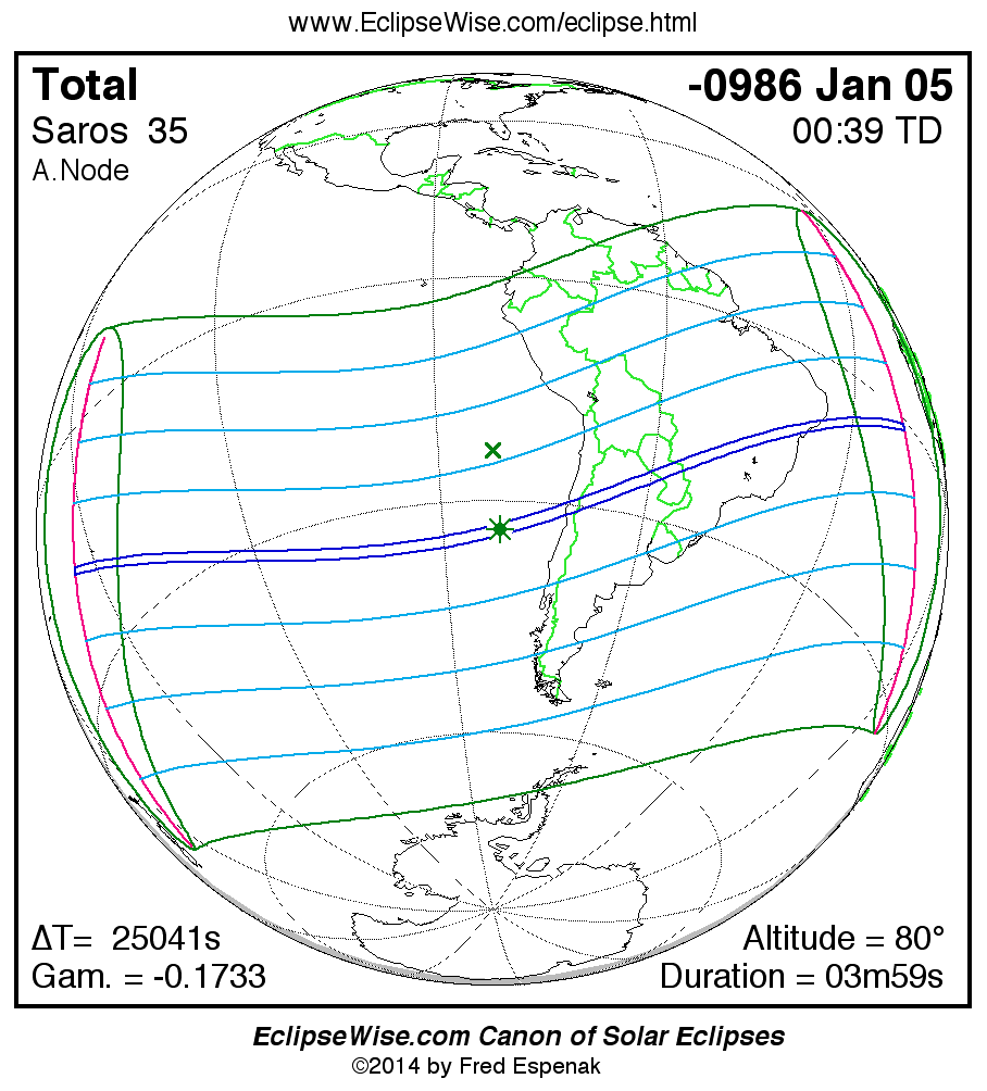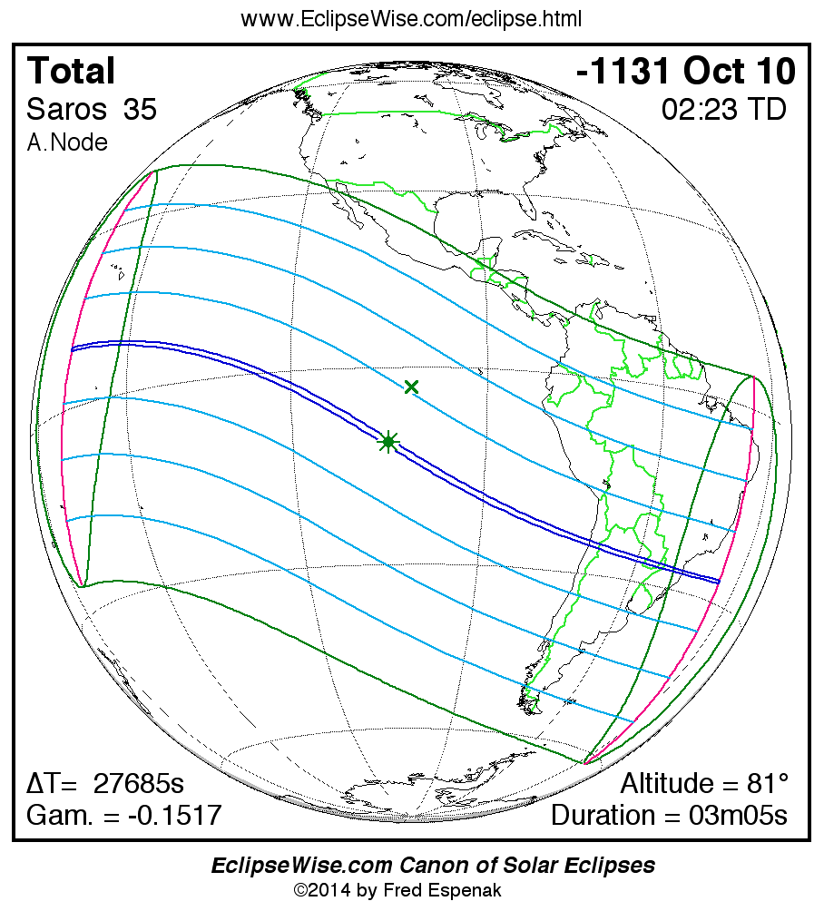 A panorama of all solar eclipses belonging to Saros 35 is presented here. Each map depicts the geographic region of visibility for a single eclipse. For central eclipses, the total or annular path is plotted in either blue (total) or red (annular). The date and time is given for the instant of Greatest Eclipse. Every map serves as a hyperlink to the EclipseWise Prime page for that eclipse where a larger map and complete details for the eclipse can be found. Visit the Key to Solar Eclipse Maps for a detailed explanation of these maps. Near the bottom of the page are a series of hyperlinks for more on solar eclipses.