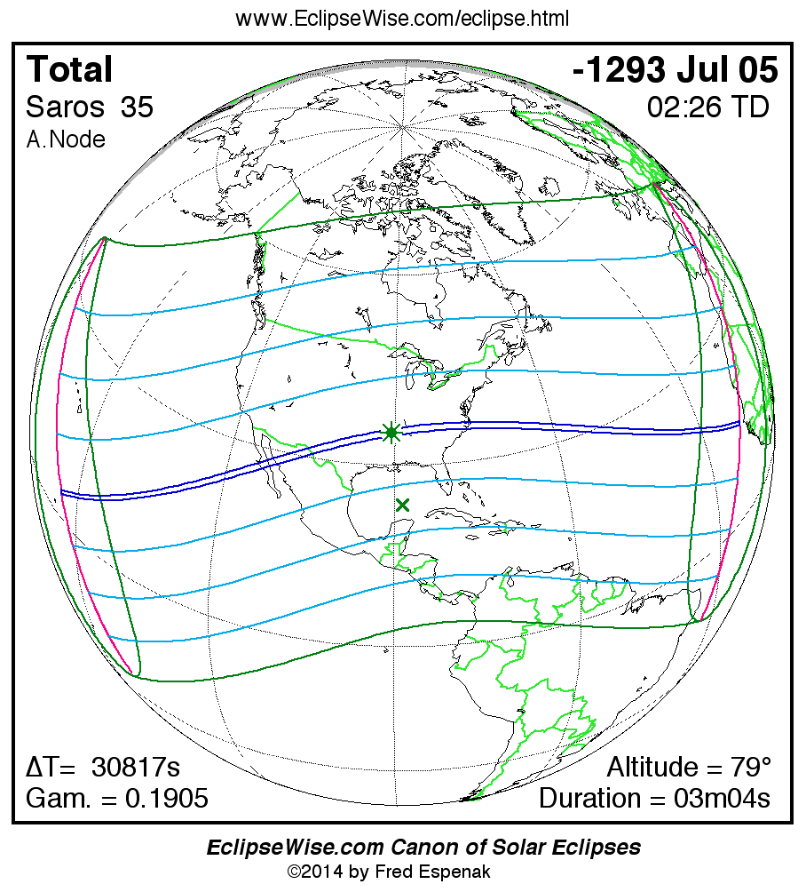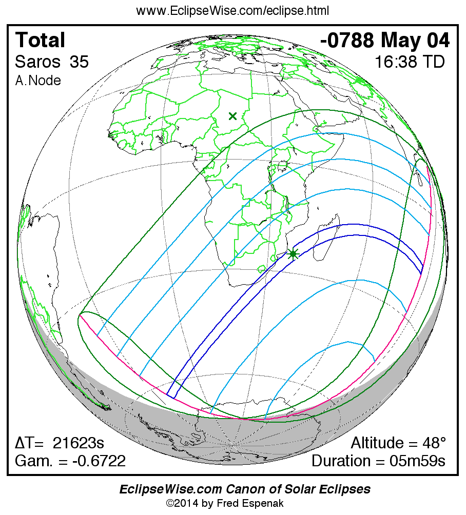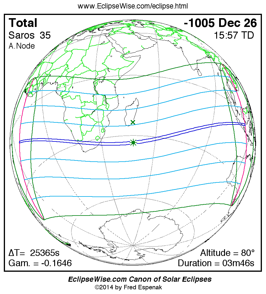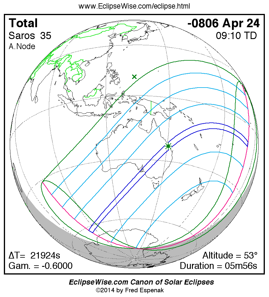 A panorama of all solar eclipses belonging to Saros 35 is presented here. Each map depicts the geographic region of visibility for a single eclipse. For central eclipses, the total or annular path is plotted in either blue (total) or red (annular). The date and time is given for the instant of Greatest Eclipse. Every map serves as a hyperlink to the EclipseWise Prime page for that eclipse where a larger map and complete details for the eclipse can be found. Visit the Key to Solar Eclipse Maps for a detailed explanation of these maps. Near the bottom of the page are a series of hyperlinks for more on solar eclipses.