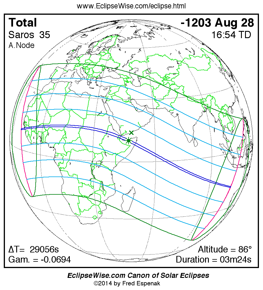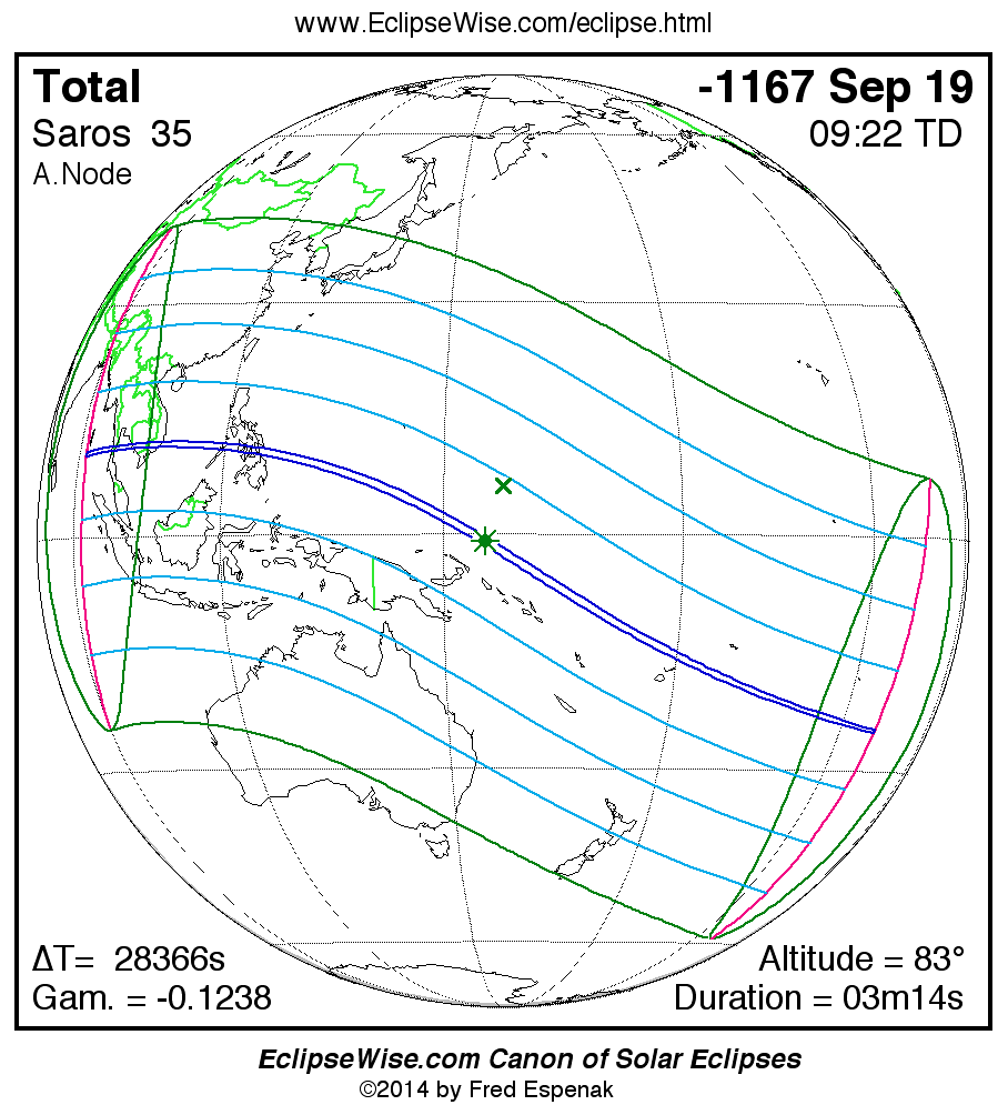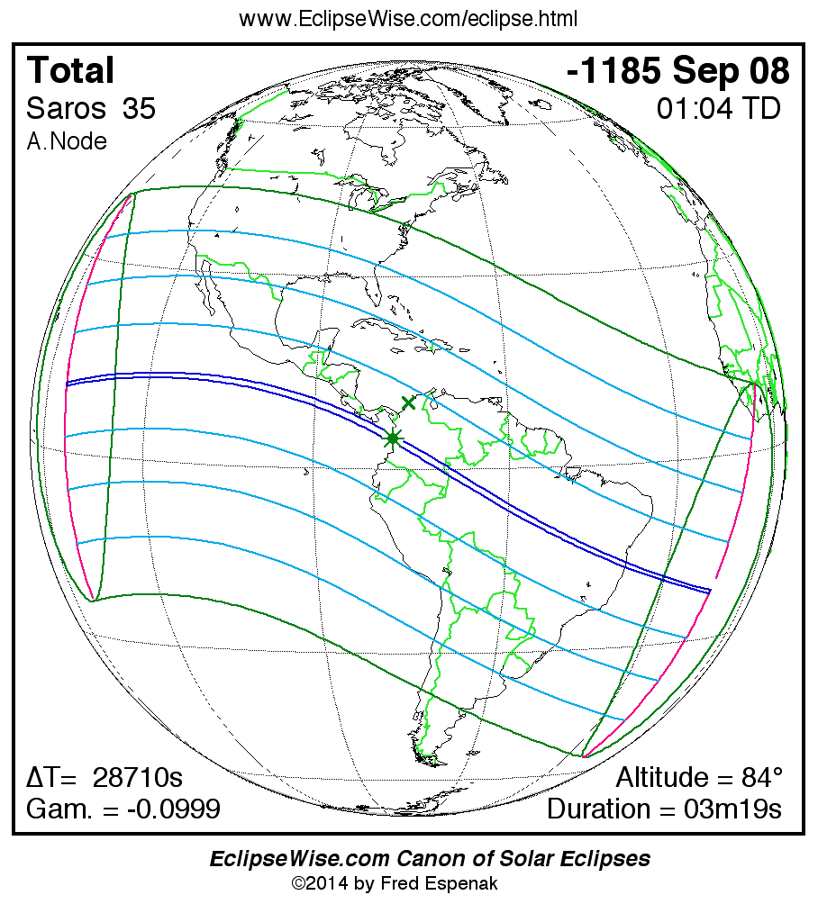 The Saros panorama below is arranged in horizontal rows of 3 eclipses. So one eclipse to the left or right is a difference of 1 Saros cycle, and one eclipse above or below is a difference of 1 exeligmos. By scanning a column of the table, it reveals how the geographic visibility of eclipses separated by an exeligmos slowly changes.