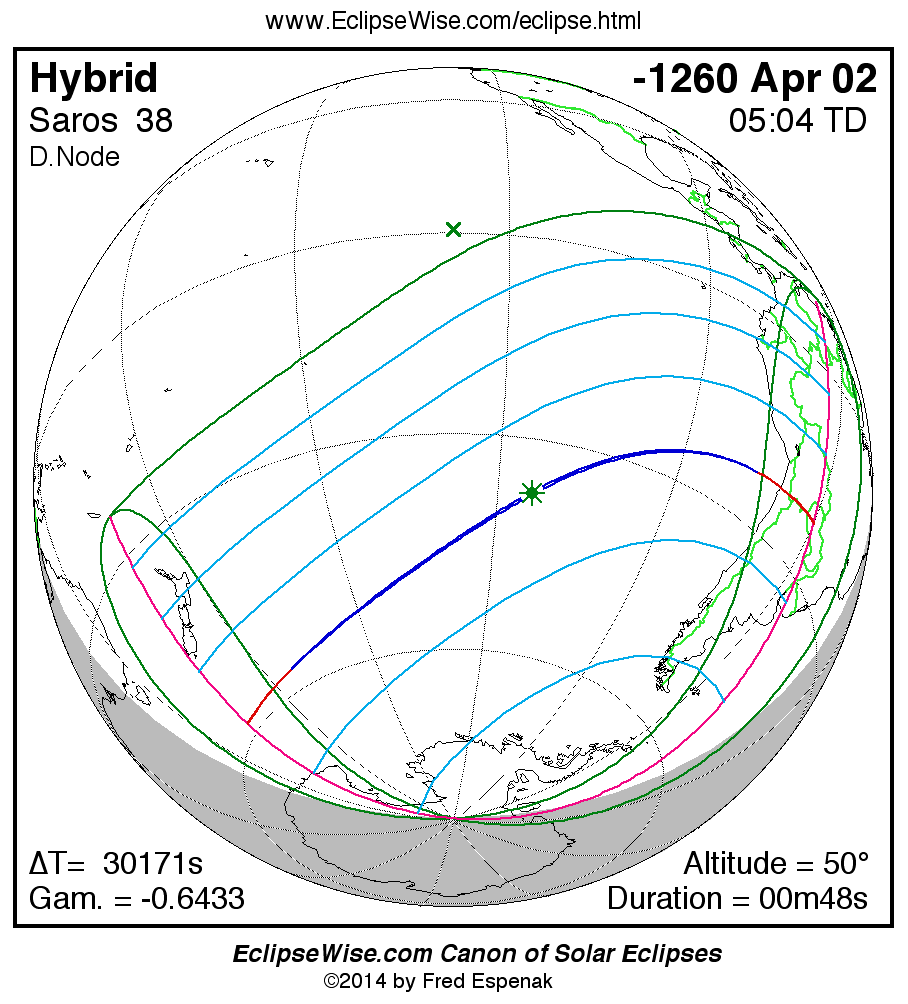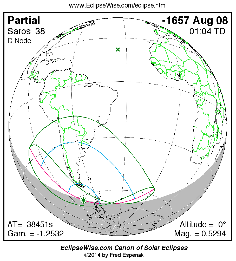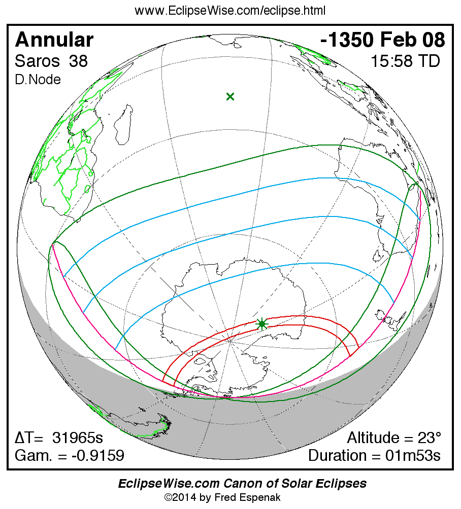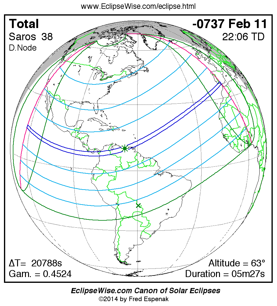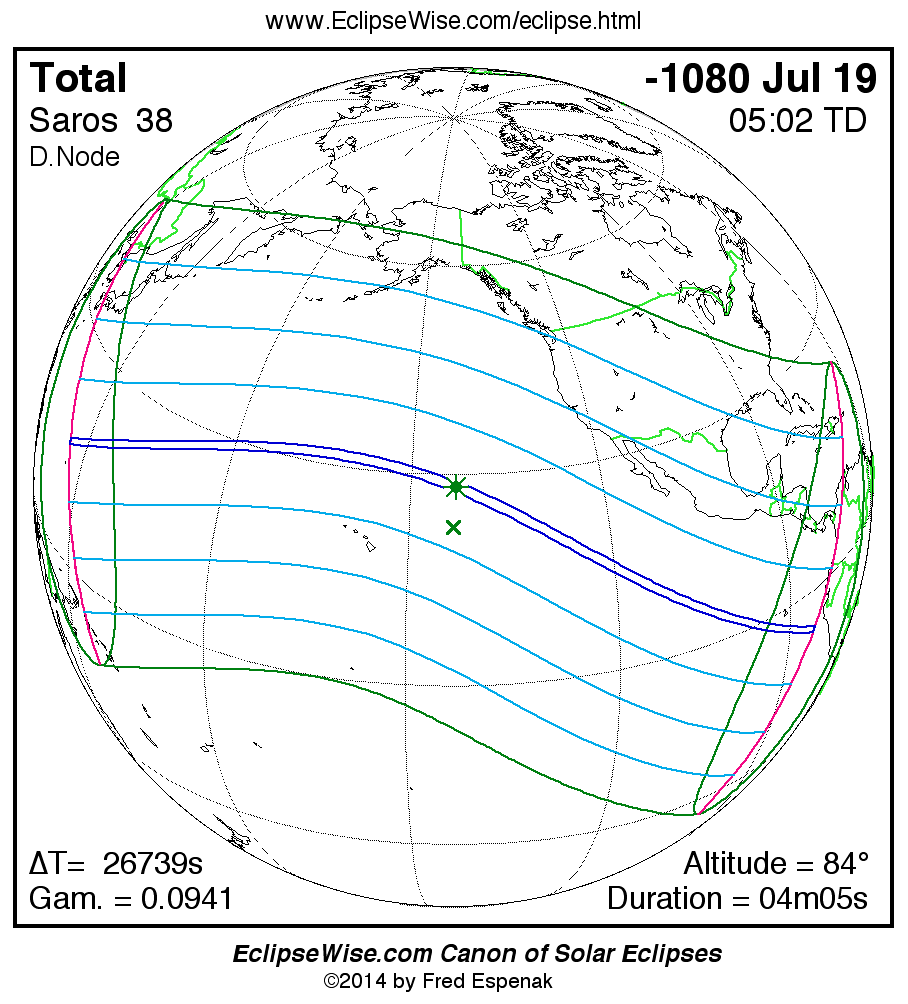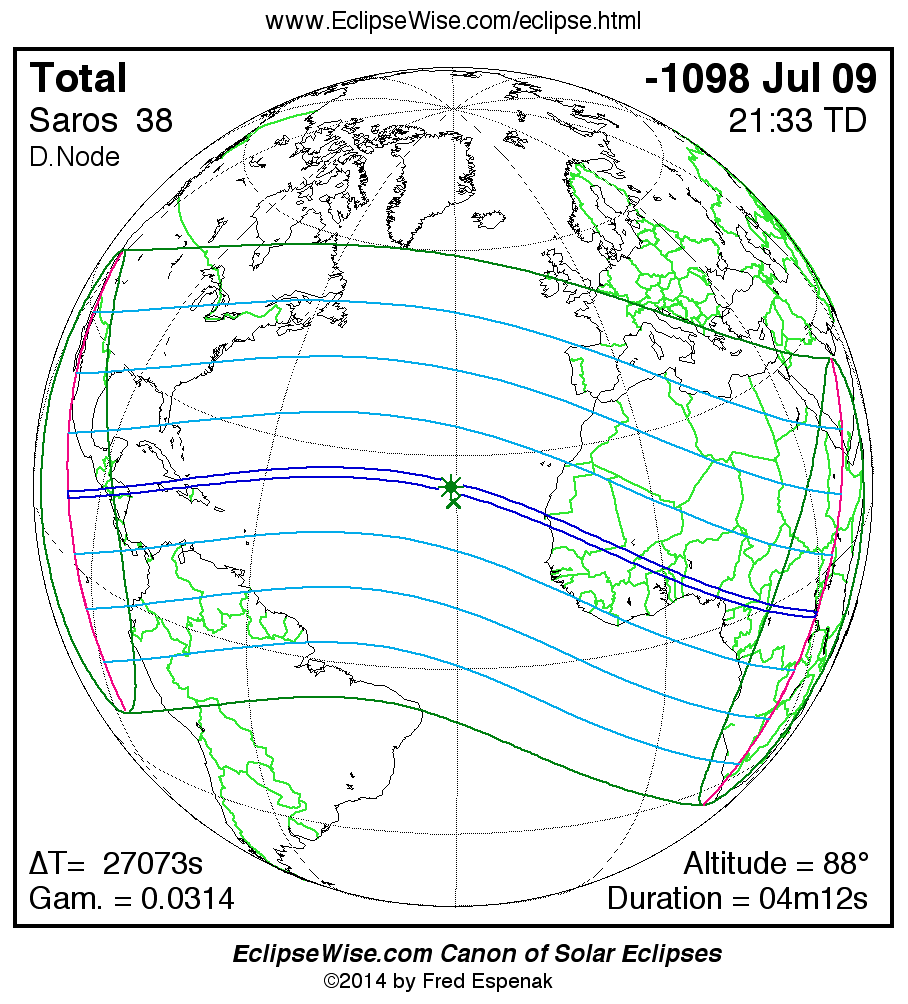 A panorama of all solar eclipses belonging to Saros 38 is presented here. Each map depicts the geographic region of visibility for a single eclipse. For central eclipses, the total or annular path is plotted in either blue (total) or red (annular). The date and time is given for the instant of Greatest Eclipse. Every map serves as a hyperlink to the EclipseWise Prime page for that eclipse where a larger map and complete details for the eclipse can be found. Visit the Key to Solar Eclipse Maps for a detailed explanation of these maps. Near the bottom of the page are a series of hyperlinks for more on solar eclipses.