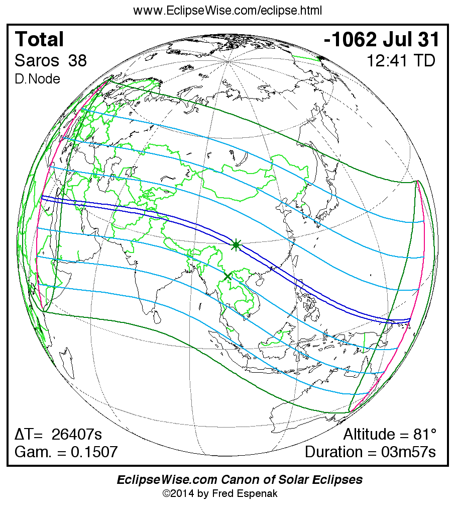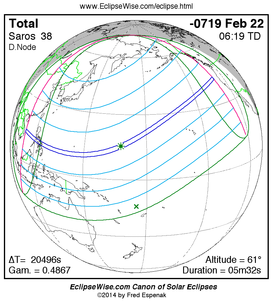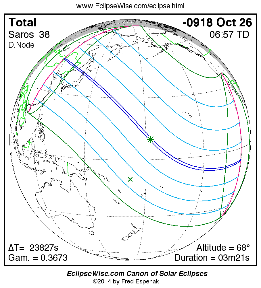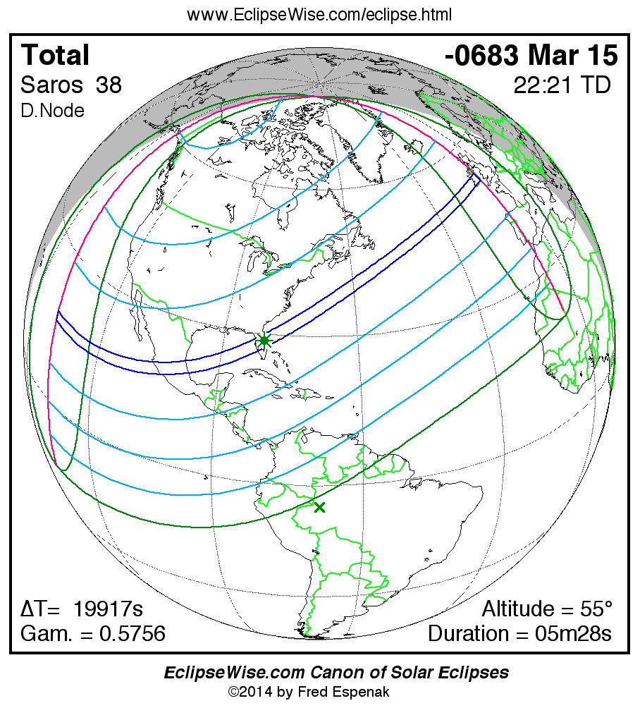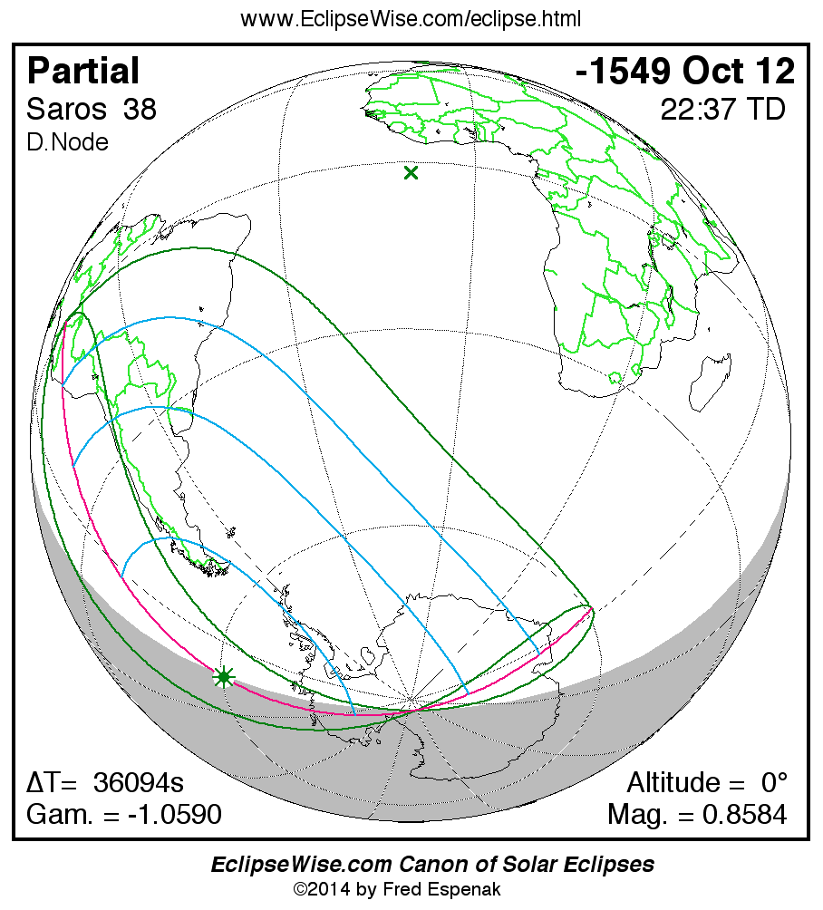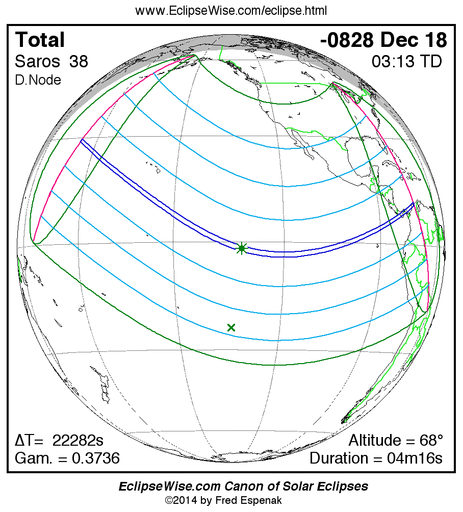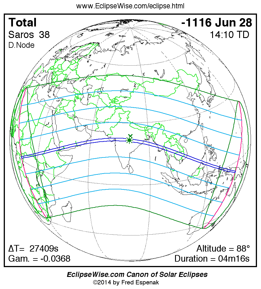 A panorama of all solar eclipses belonging to Saros 38 is presented here. Each map depicts the geographic region of visibility for a single eclipse. For central eclipses, the total or annular path is plotted in either blue (total) or red (annular). The date and time is given for the instant of Greatest Eclipse. Every map serves as a hyperlink to the EclipseWise Prime page for that eclipse where a larger map and complete details for the eclipse can be found. Visit the Key to Solar Eclipse Maps for a detailed explanation of these maps. Near the bottom of the page are a series of hyperlinks for more on solar eclipses.
