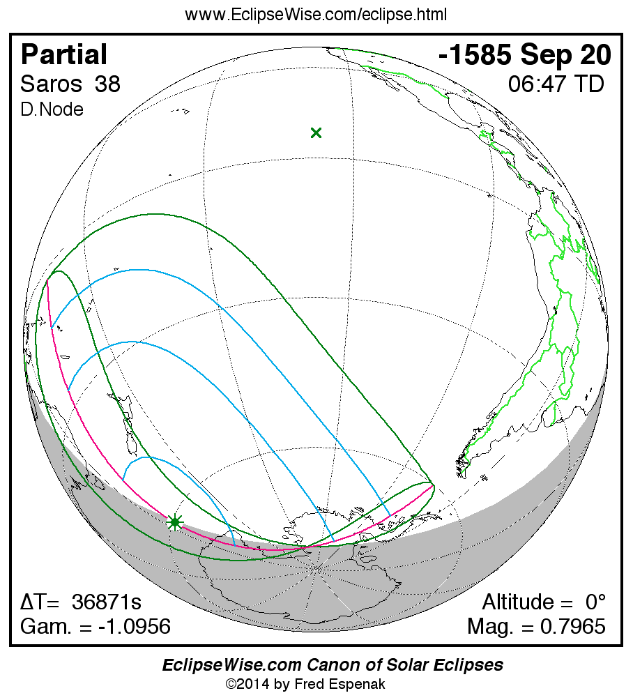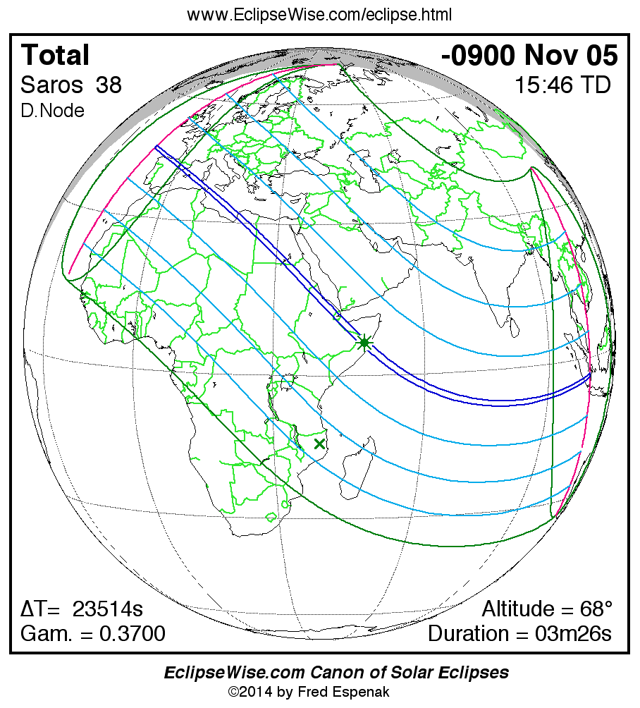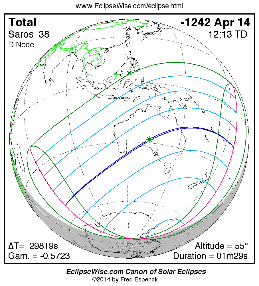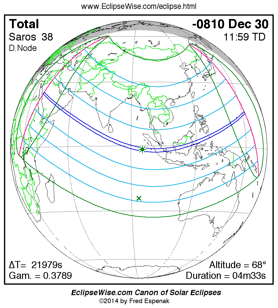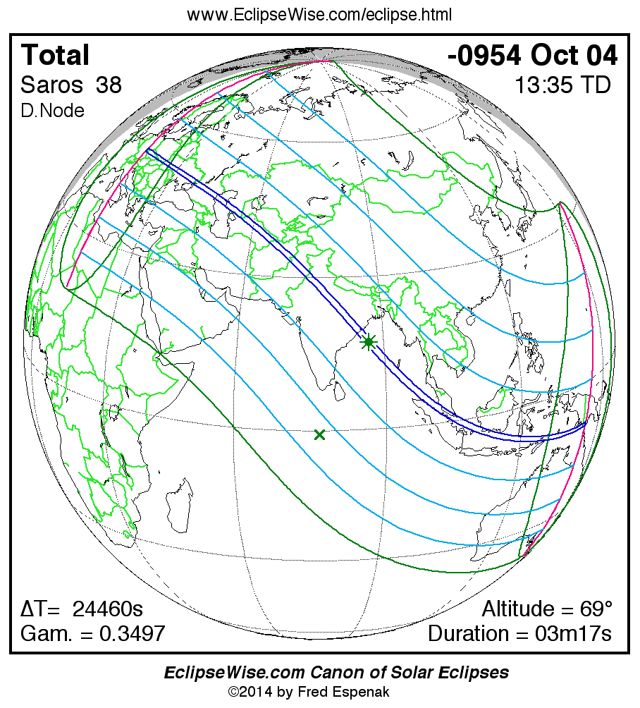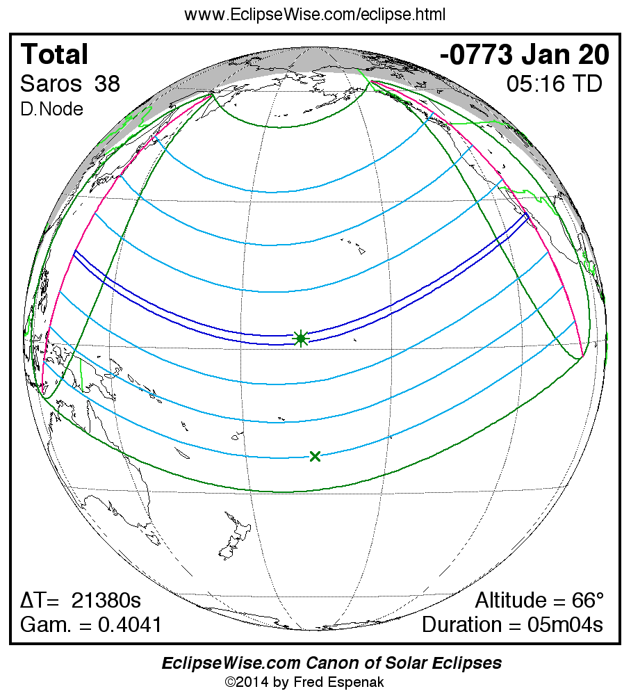 A panorama of all solar eclipses belonging to Saros 38 is presented here. Each map depicts the geographic region of visibility for a single eclipse. For central eclipses, the total or annular path is plotted in either blue (total) or red (annular). The date and time is given for the instant of Greatest Eclipse. Every map serves as a hyperlink to the EclipseWise Prime page for that eclipse where a larger map and complete details for the eclipse can be found. Visit the Key to Solar Eclipse Maps for a detailed explanation of these maps. Near the bottom of the page are a series of hyperlinks for more on solar eclipses.
