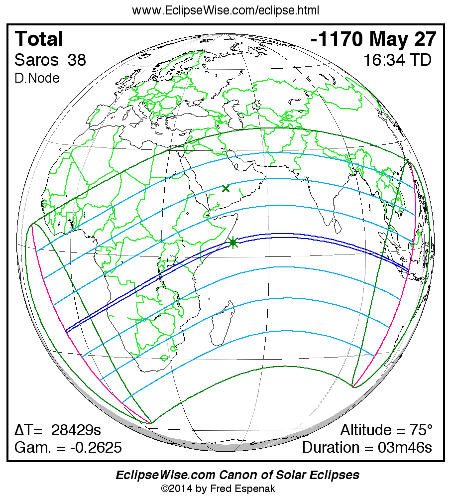 The Saros panorama below is arranged in horizontal rows of 3 eclipses. So one eclipse to the left or right is a difference of 1 Saros cycle, and one eclipse above or below is a difference of 1 exeligmos. By scanning a column of the table, it reveals how the geographic visibility of eclipses separated by an exeligmos slowly changes.