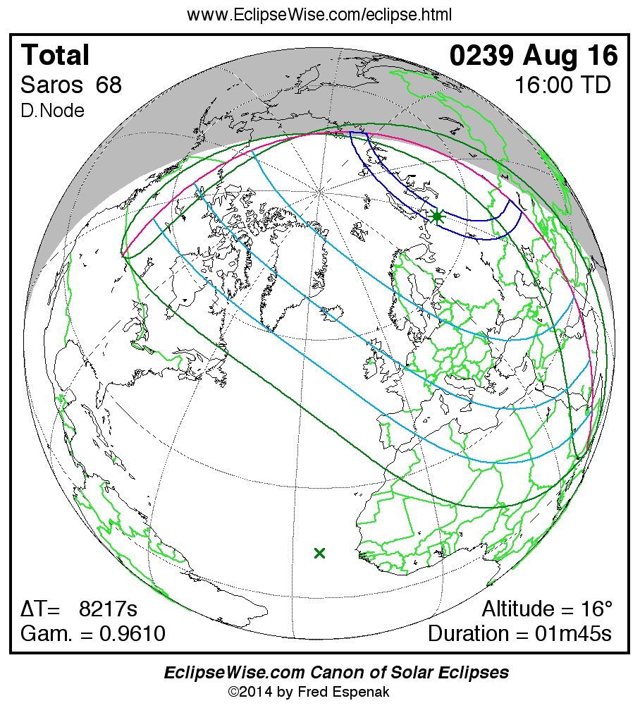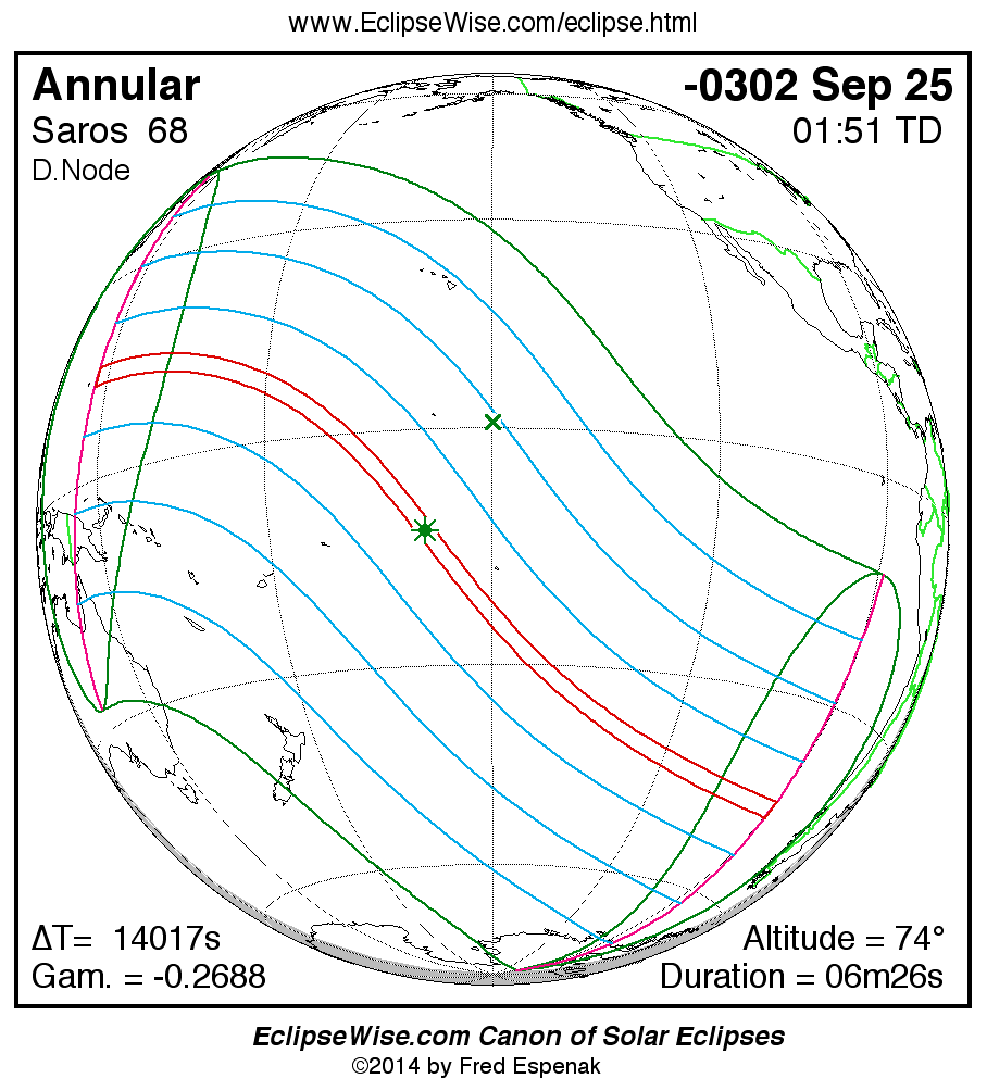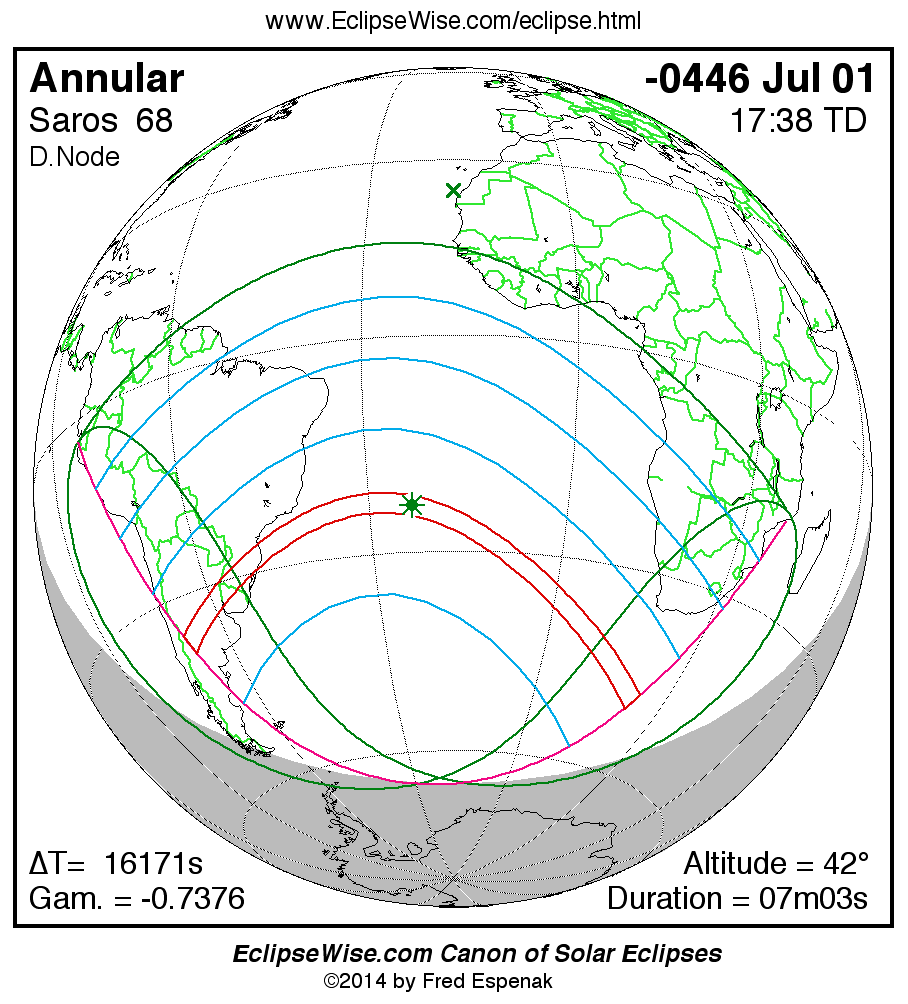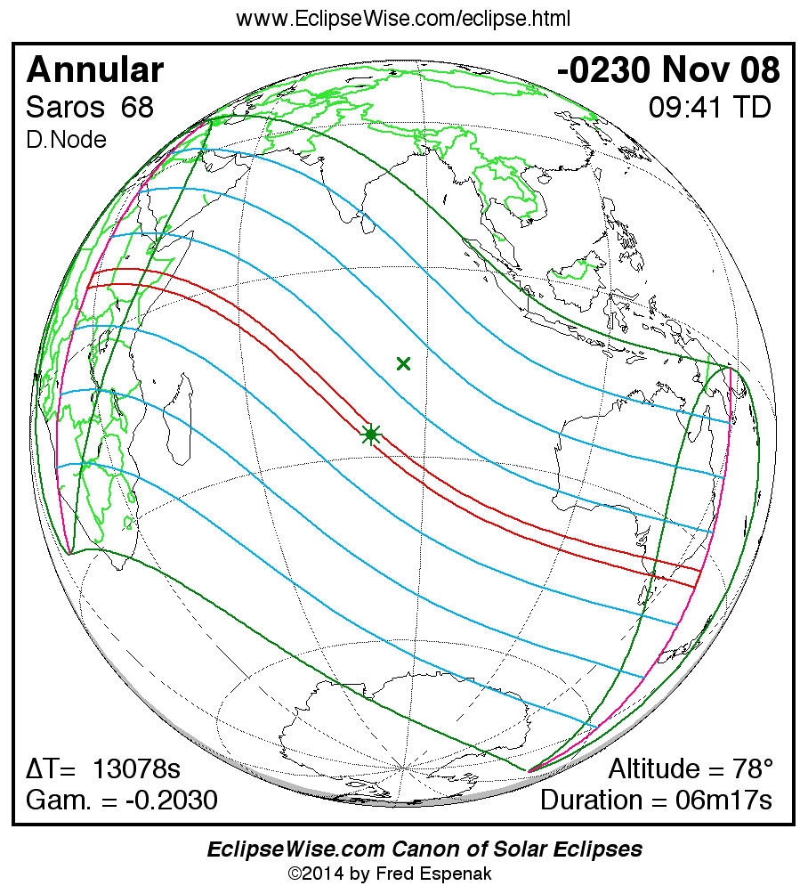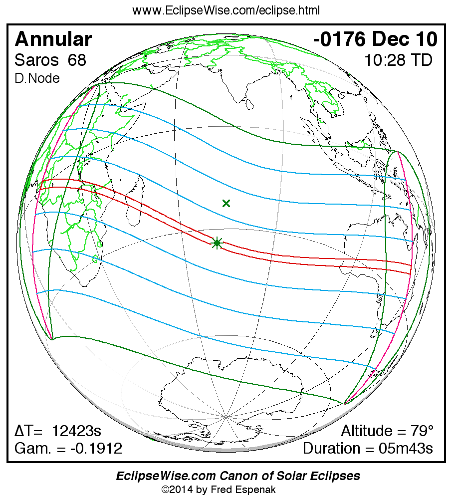 A panorama of all solar eclipses belonging to Saros 68 is presented here. Each map depicts the geographic region of visibility for a single eclipse. For central eclipses, the total or annular path is plotted in either blue (total) or red (annular). The date and time is given for the instant of Greatest Eclipse. Every map serves as a hyperlink to the EclipseWise Prime page for that eclipse where a larger map and complete details for the eclipse can be found. Visit the Key to Solar Eclipse Maps for a detailed explanation of these maps. Near the bottom of the page are a series of hyperlinks for more on solar eclipses.