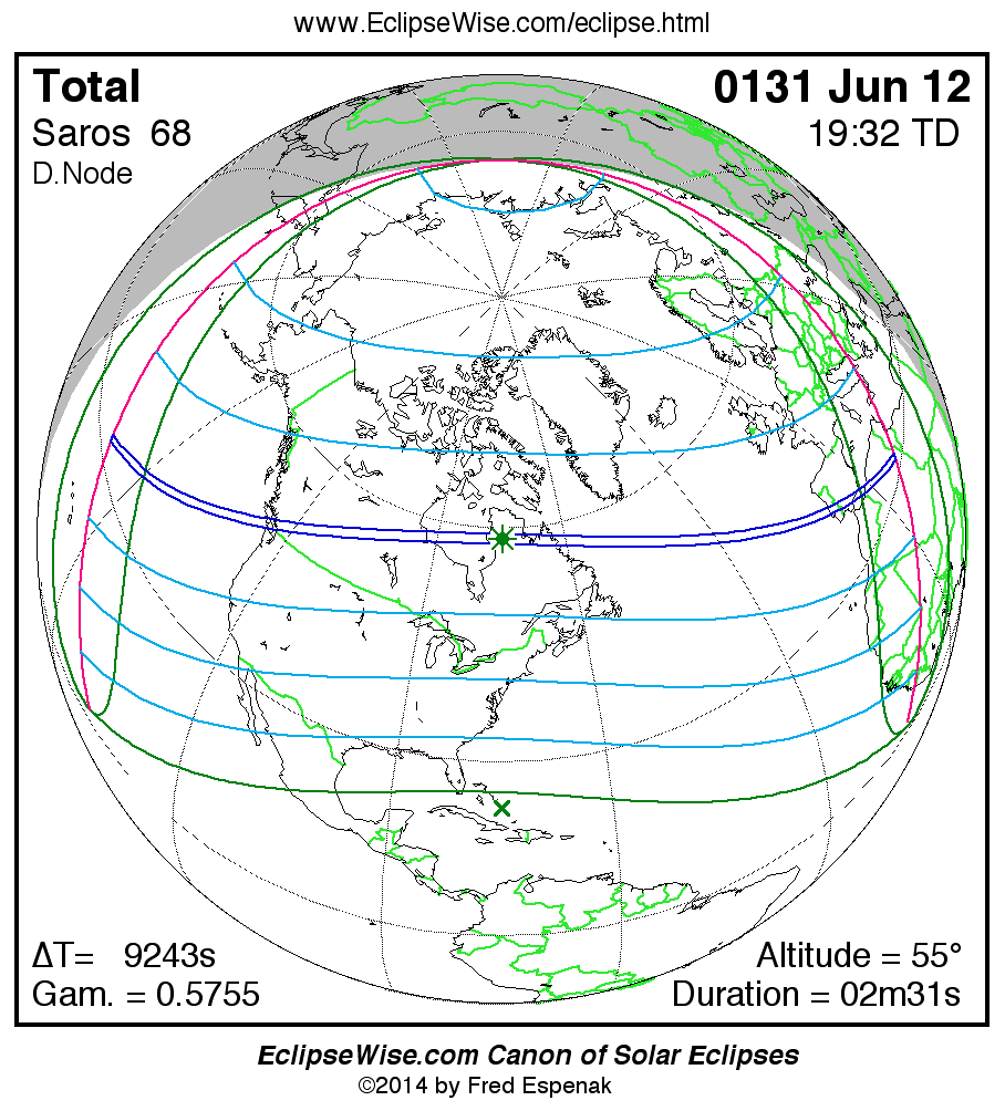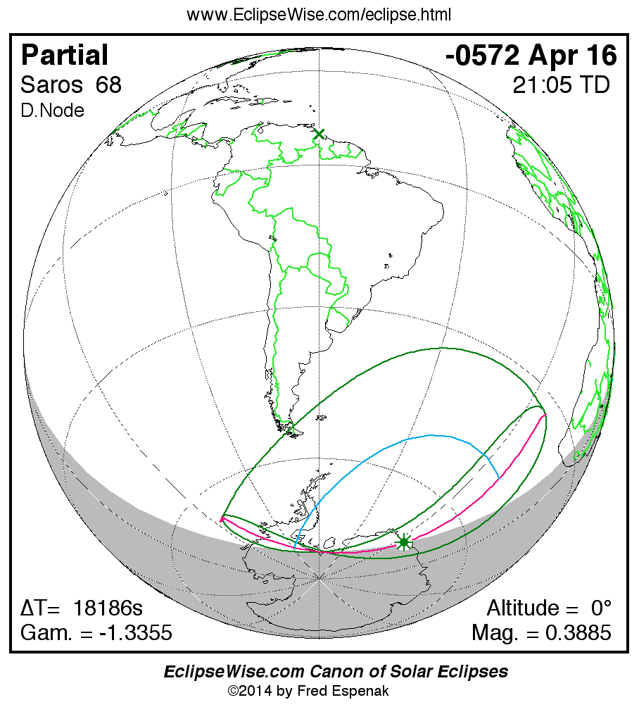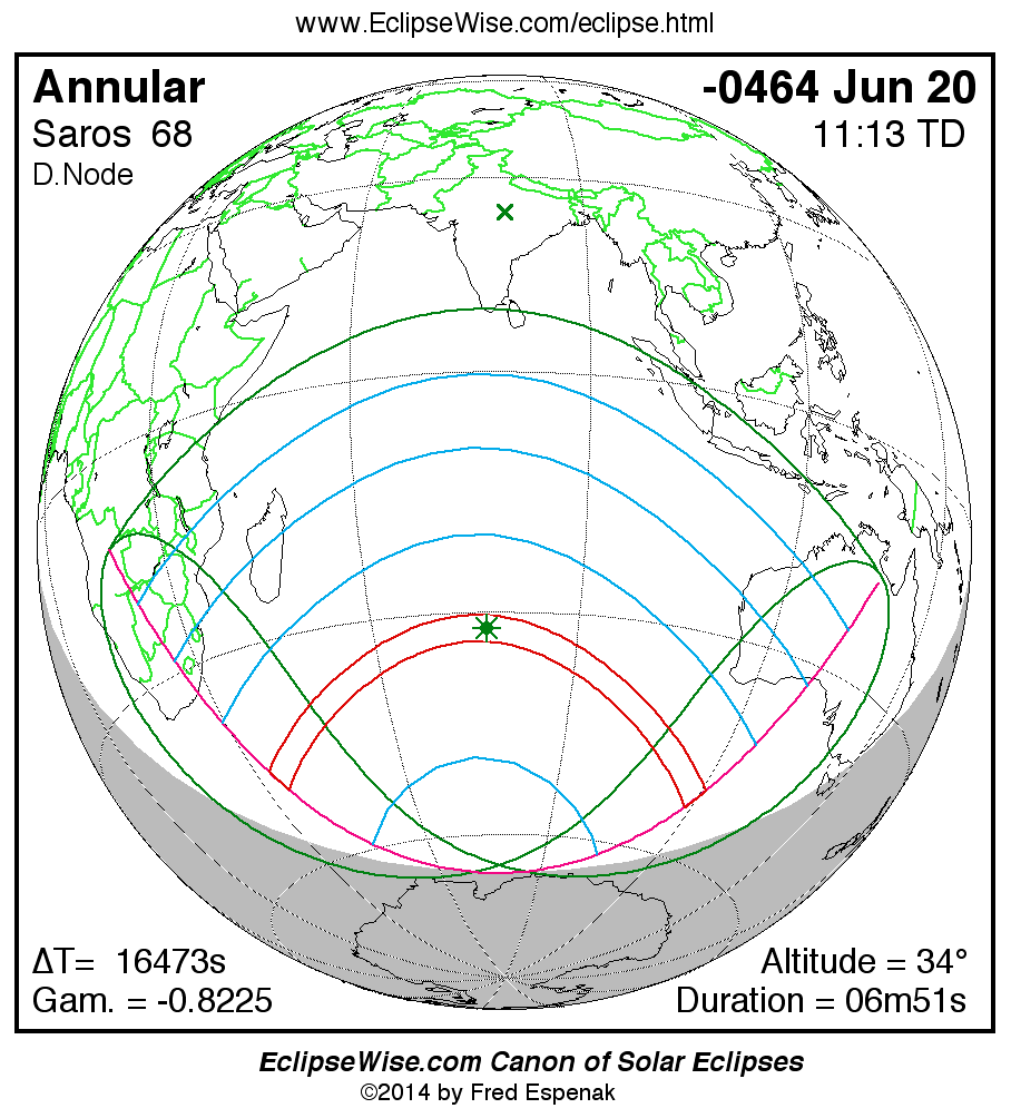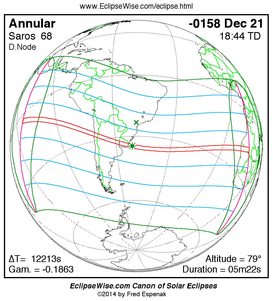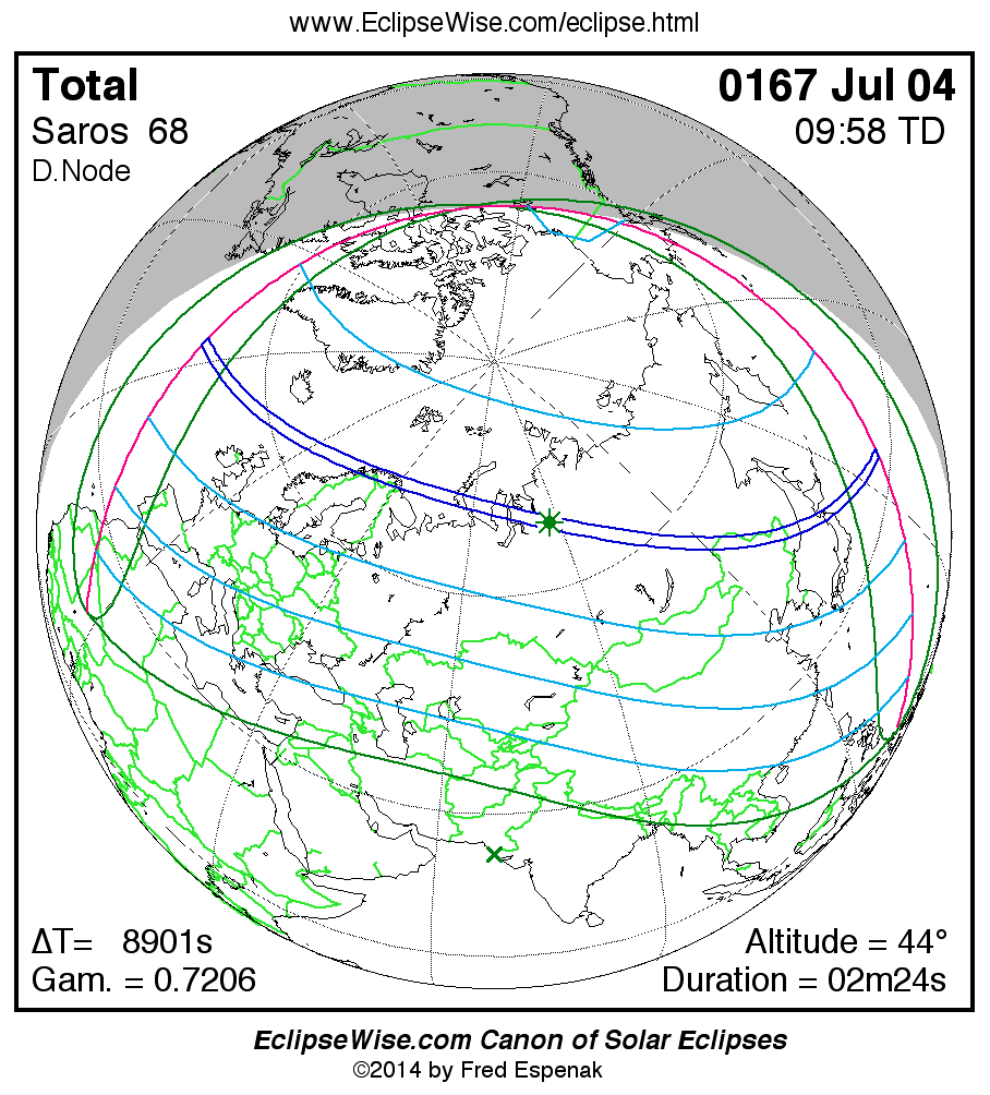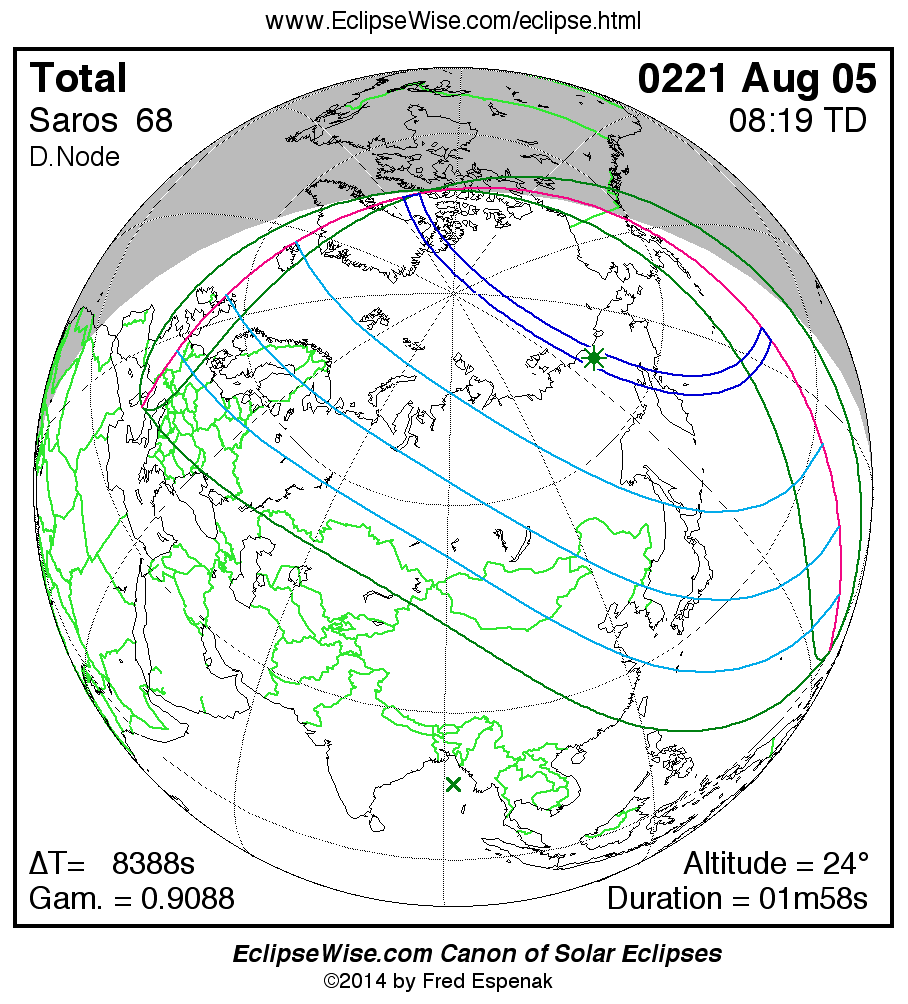 A panorama of all solar eclipses belonging to Saros 68 is presented here. Each map depicts the geographic region of visibility for a single eclipse. For central eclipses, the total or annular path is plotted in either blue (total) or red (annular). The date and time is given for the instant of Greatest Eclipse. Every map serves as a hyperlink to the EclipseWise Prime page for that eclipse where a larger map and complete details for the eclipse can be found. Visit the Key to Solar Eclipse Maps for a detailed explanation of these maps. Near the bottom of the page are a series of hyperlinks for more on solar eclipses.