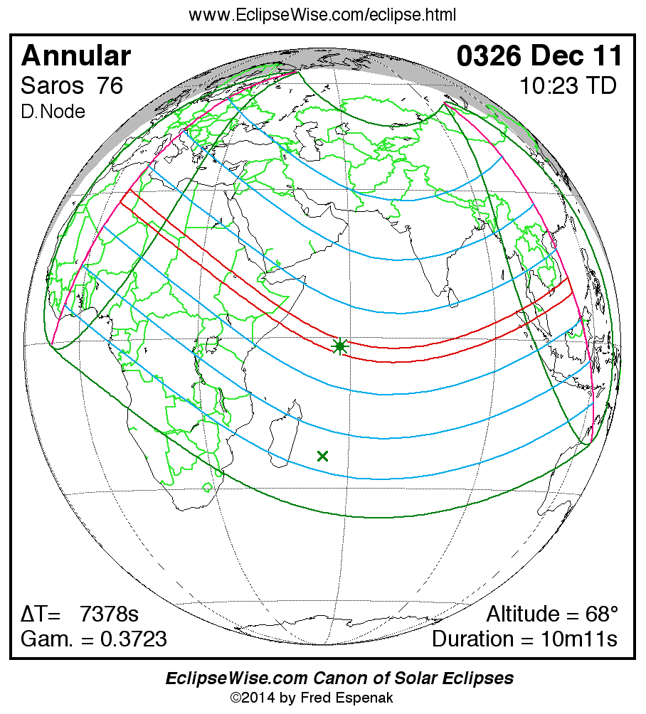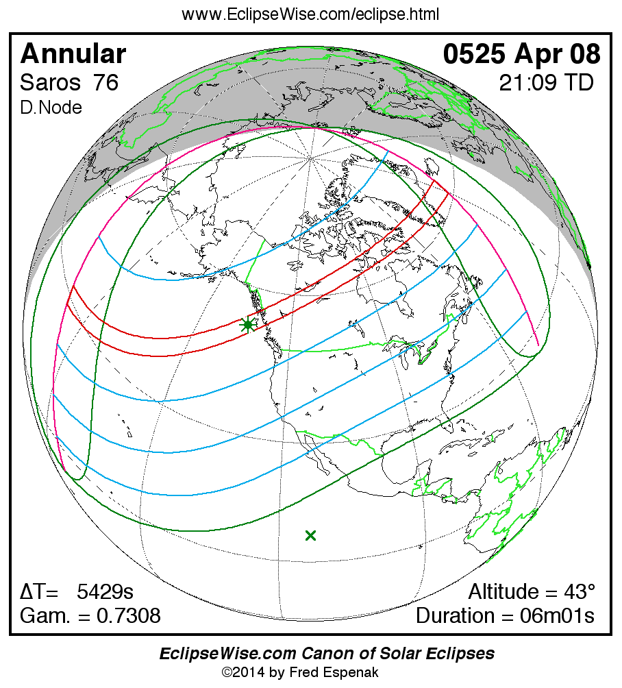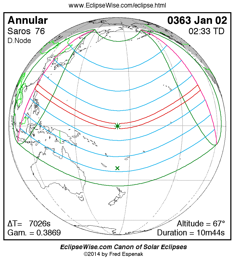 A panorama of all solar eclipses belonging to Saros 76 is presented here. Each map depicts the geographic region of visibility for a single eclipse. For central eclipses, the total or annular path is plotted in either blue (total) or red (annular). The date and time is given for the instant of Greatest Eclipse. Every map serves as a hyperlink to the EclipseWise Prime page for that eclipse where a larger map and complete details for the eclipse can be found. Visit the Key to Solar Eclipse Maps for a detailed explanation of these maps. Near the bottom of the page are a series of hyperlinks for more on solar eclipses.
